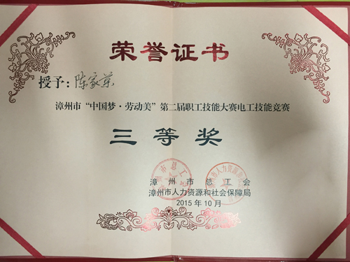 2015年10月28日,為期2天的漳州市“中國(guó)夢(mèng)?勞動(dòng)美” 第二屆技能大賽維修電工技能競(jìng)賽圓滿落下帷幕。黃忠灼、游照輝、陳家榮、許志榕、楊文遠(yuǎn)、李源森等6名員工代表公司參加競(jìng)賽。他們?cè)诟?jìng)賽中發(fā)揮出了自己的水平,其中陳家榮榮獲三等獎(jiǎng)。