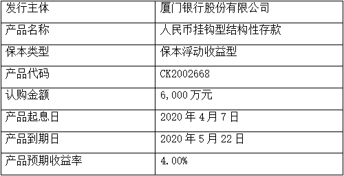 委托理財產(chǎn)品名稱:人民幣掛鉤型結(jié)構(gòu)性存款CK2002668。