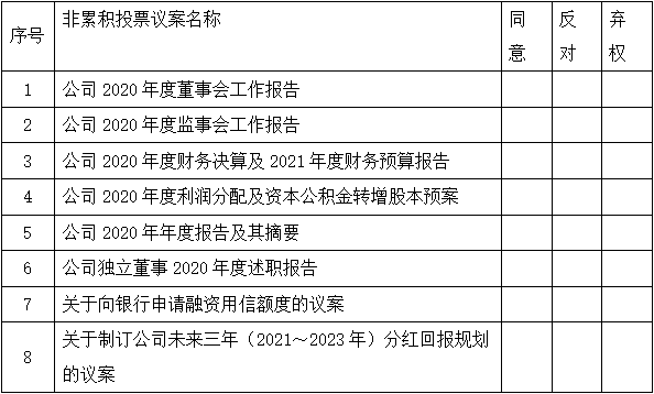 備注:委托人應(yīng)在委托書中“同意”、“反對”或“棄權(quán)”意向中選擇一個并打“√”,對于委托人在本授權(quán)委托書中未作具體指示的,受托人有權(quán)按自己的意愿進(jìn)行表決。