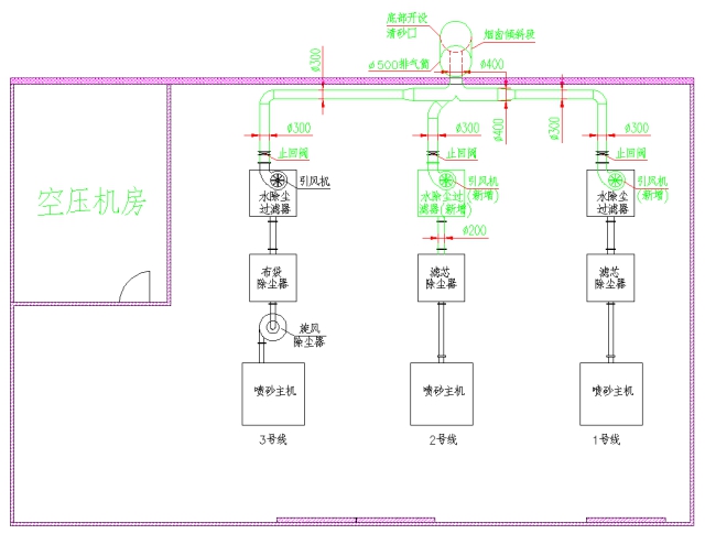 1)我司現(xiàn)有三條噴砂線,其中有兩臺(tái)為含水除塵設(shè)備,另一臺(tái)不含水除塵設(shè)備。本次噴砂粉塵處理系統(tǒng)需配備一臺(tái)水除塵設(shè)備,并將三條噴砂線的尾氣引外排放,且滿足三條噴砂線同時(shí)運(yùn)行排氣的需求。