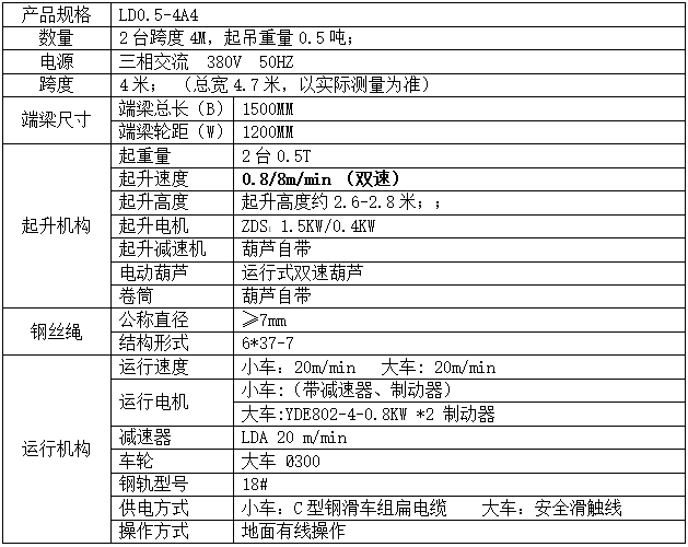 0.5噸單梁橋式起重機,需根據(jù)我司現(xiàn)場條件,全新安裝立柱、導軌、橫梁等,配置兩臺全新單梁橋式起重機。
