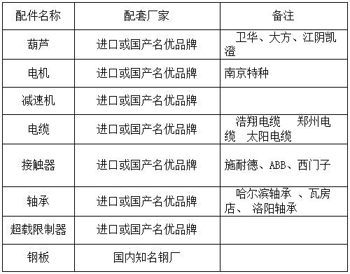 (8)起升機構(gòu):名優(yōu)品牌鋼絲繩葫蘆(如衛(wèi)華、大方、江陰凱澄等)。