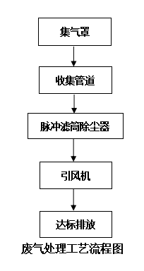 該項(xiàng)目砂帶機(jī)廢氣風(fēng)量小,主要為細(xì)小顆粒粉塵,選用脈沖濾筒除塵器處理粉塵,初步流程見(jiàn)下圖。