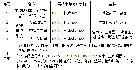 自動(dòng)鍍鉻生產(chǎn)線現(xiàn)有鍍槽-中控槽鍍液循環(huán)系統(tǒng)塑料材質(zhì)管道(管道、接頭與閥體)使用到一定年限老化,其中的溢流管路、回液管路及閥件將更新為鈦材料。