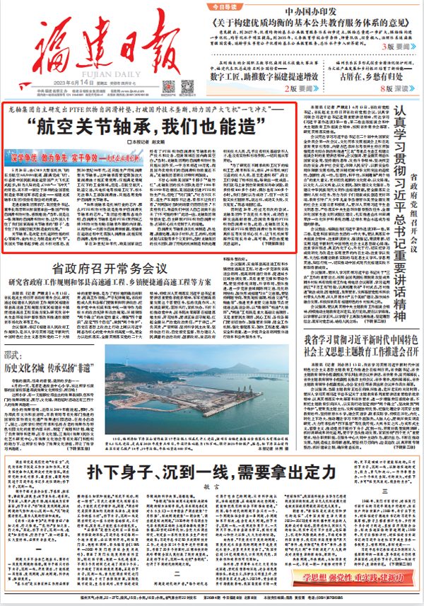 6月14日,《龍軸集團自主研發(fā)出PTFE織物自潤滑襯墊,打破國外技術壟斷,助力國產大飛機“一飛沖天”——“航空關節(jié)軸承,我們也能造”》榮登《福建日報》頭版頭條。
