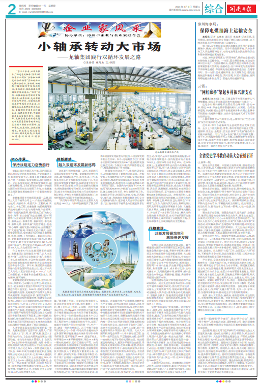 “求木之長者,必固其根本?!备=埾S承(集團)股份有限公司把“堅持和加強黨的全面領導”貫徹到企業(yè)發(fā)展的全過程、各領域,始終踐行國際國內市場雙向發(fā)力,苦練內功、搶抓機遇占領國際市場制高點,“雙師”并行、拓展配套培育國內市場增長點,成果豐碩,先后榮獲全國文明單位、全國首批制造業(yè)單項冠軍示范企業(yè)、全國首批工業(yè)品牌培育示范企業(yè)、全國模范勞動關系和諧企業(yè)、福建省質量獎、中國創(chuàng)新力企業(yè)百強等稱號。2020年,龍軸集團克服新冠疫情及中美貿易摩擦導致市場需求大幅下降的不利影響,危中尋機、化危為機,實現(xiàn)逆勢增長,營業(yè)收入同比增長22.45%,創(chuàng)歷史新高,歸屬母公司凈利潤同比增長99.51%。