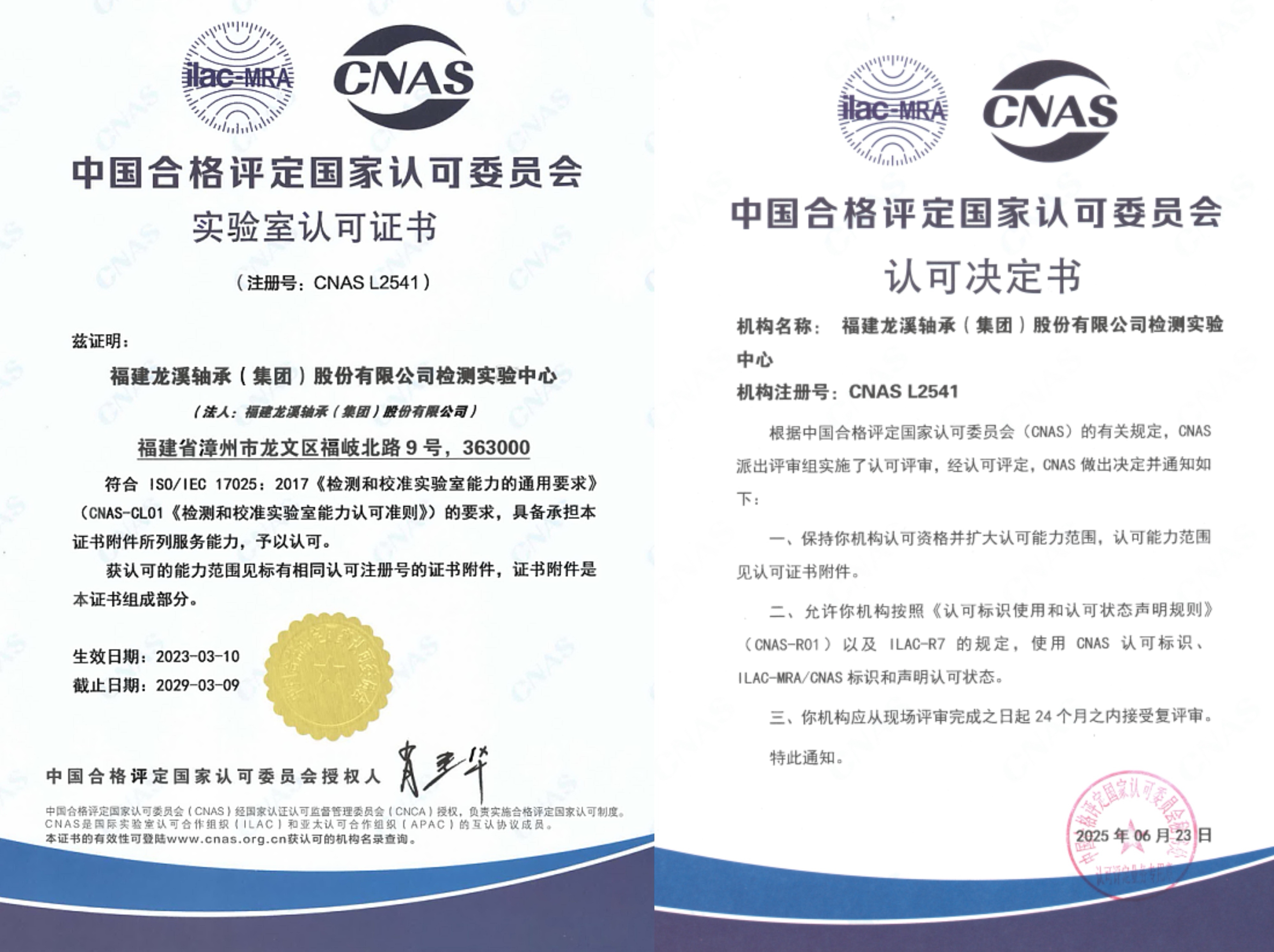 近日,龍軸集團(tuán)檢測(cè)實(shí)驗(yàn)中心順利通過(guò)中國(guó)合格評(píng)定國(guó)家認(rèn)可委員會(huì)(CNAS)擴(kuò)項(xiàng)評(píng)審,獲得認(rèn)可決定書(shū)和實(shí)驗(yàn)室認(rèn)可證書(shū),標(biāo)志著公司在軸承可靠性驗(yàn)證、材料微觀分析等核心技術(shù)領(lǐng)域?qū)崿F(xiàn)重大突破,已構(gòu)建覆蓋從材料到產(chǎn)品的檢測(cè)服務(wù)體系,檢測(cè)能力達(dá)到國(guó)內(nèi)先進(jìn)水平。