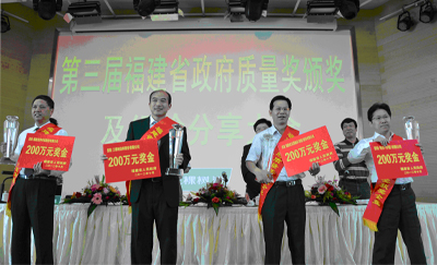 2012年10月19日上午,第三屆福建省政府質(zhì)量獎(jiǎng)?lì)C獎(jiǎng)大會(huì)在莆田召開,我司被福建省人民政府授予“2011年度福建省政府質(zhì)量獎(jiǎng)”,成為我市首家榮獲此獎(jiǎng)項(xiàng)的企業(yè)。福建省質(zhì)量技術(shù)監(jiān)督局局長黃維禮、莆田市人民政府市長梁建勇等領(lǐng)導(dǎo)出席大會(huì)并為獲獎(jiǎng)單位頒獎(jiǎng),圖為公司黨委書記、董事長曾凡沛接受獎(jiǎng)杯和獎(jiǎng)金。