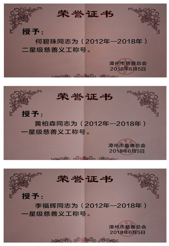 2018年6月5日,首屆漳州市星級慈善義工分隊、星級慈善義工授星儀式在漳州市慈善總會舉行,公司何碧珠同志榮獲二星級慈善義工稱號,黃柏森同志和李福輝同志榮獲一星級慈善義工稱號。公司義工分隊自2012年成立以來,圍繞“志愿、無償、友愛、互助”的服務(wù)精神,在扶貧濟(jì)困、安老扶幼、助學(xué)助醫(yī)、社區(qū)服務(wù)、慈善宣傳等方面積極開展志愿服務(wù)活動,為建設(shè)美麗、富裕、幸福漳州做出了龍軸貢獻(xiàn),充分體現(xiàn)了公司做為全國文明單位在履行社會責(zé)任、推進(jìn)幫扶工作的示范帶頭作用。