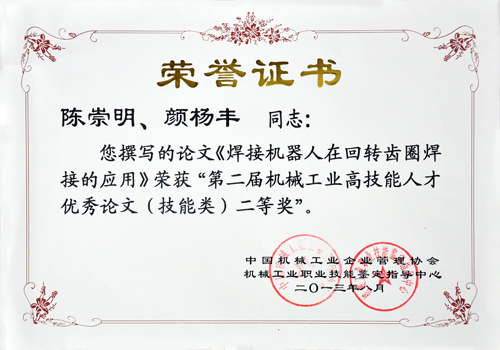 日前,由我司員工陳崇明、顏楊豐撰寫的論文《焊接機(jī)器人在回轉(zhuǎn)齒圈焊接的應(yīng)用》榮獲由中國(guó)機(jī)械工業(yè)企業(yè)管理協(xié)會(huì)、機(jī)械工業(yè)職業(yè)技能鑒定指導(dǎo)中心聯(lián)合舉辦的“第二屆機(jī)械工業(yè)高技能人才優(yōu)秀論文評(píng)選活動(dòng)”技能類二等獎(jiǎng)。