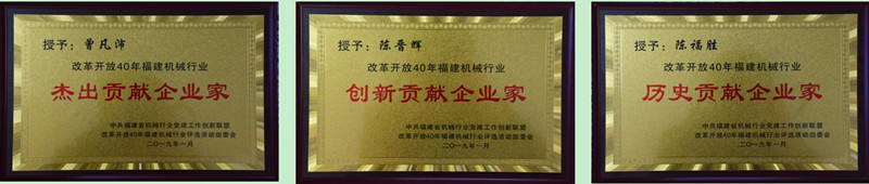 2019年1月30日,改革開(kāi)放40年福建機(jī)械行業(yè)杰出貢獻(xiàn)企業(yè)家表彰大會(huì)在福州隆重召開(kāi)。公司黨委書記、董事長(zhǎng)曾凡沛獲改革開(kāi)放40年福建機(jī)械行業(yè)杰出貢獻(xiàn)企業(yè)家殊榮;公司黨委副書記、總經(jīng)理陳晉輝獲改革開(kāi)放40年福建機(jī)械行業(yè)創(chuàng)新貢獻(xiàn)企業(yè)家殊榮;原公司黨委書記、董事長(zhǎng)陳福勝獲改革開(kāi)放40年福建機(jī)械行業(yè)歷史貢獻(xiàn)企業(yè)家殊榮。